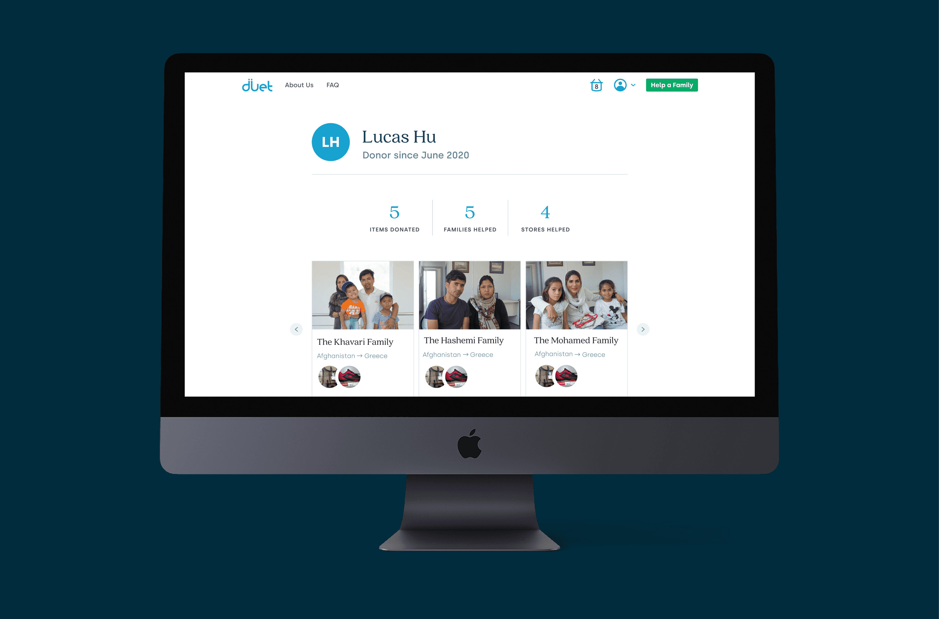 The impact page lives on the donor's individual profile, providing transparency in 3 keys features. Donors can swipe through the carousel to see the families they've donated to and the items given. The map progress bar categorizes items into distinct parts of the refugee journey where the items might be most useful. Finally, donors can see their economic impact on local communities. The more donors gives to Duet, the more this page grows.