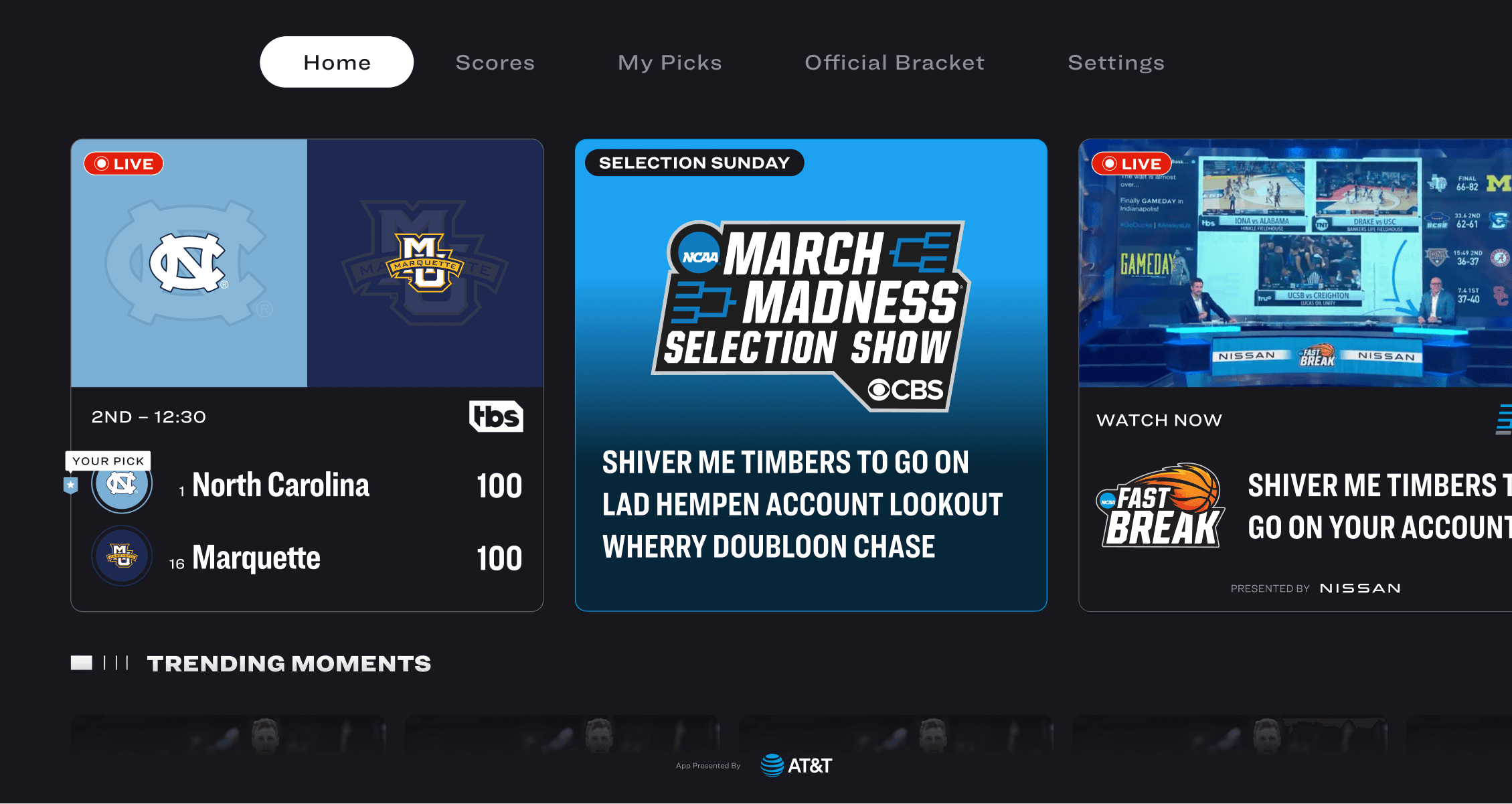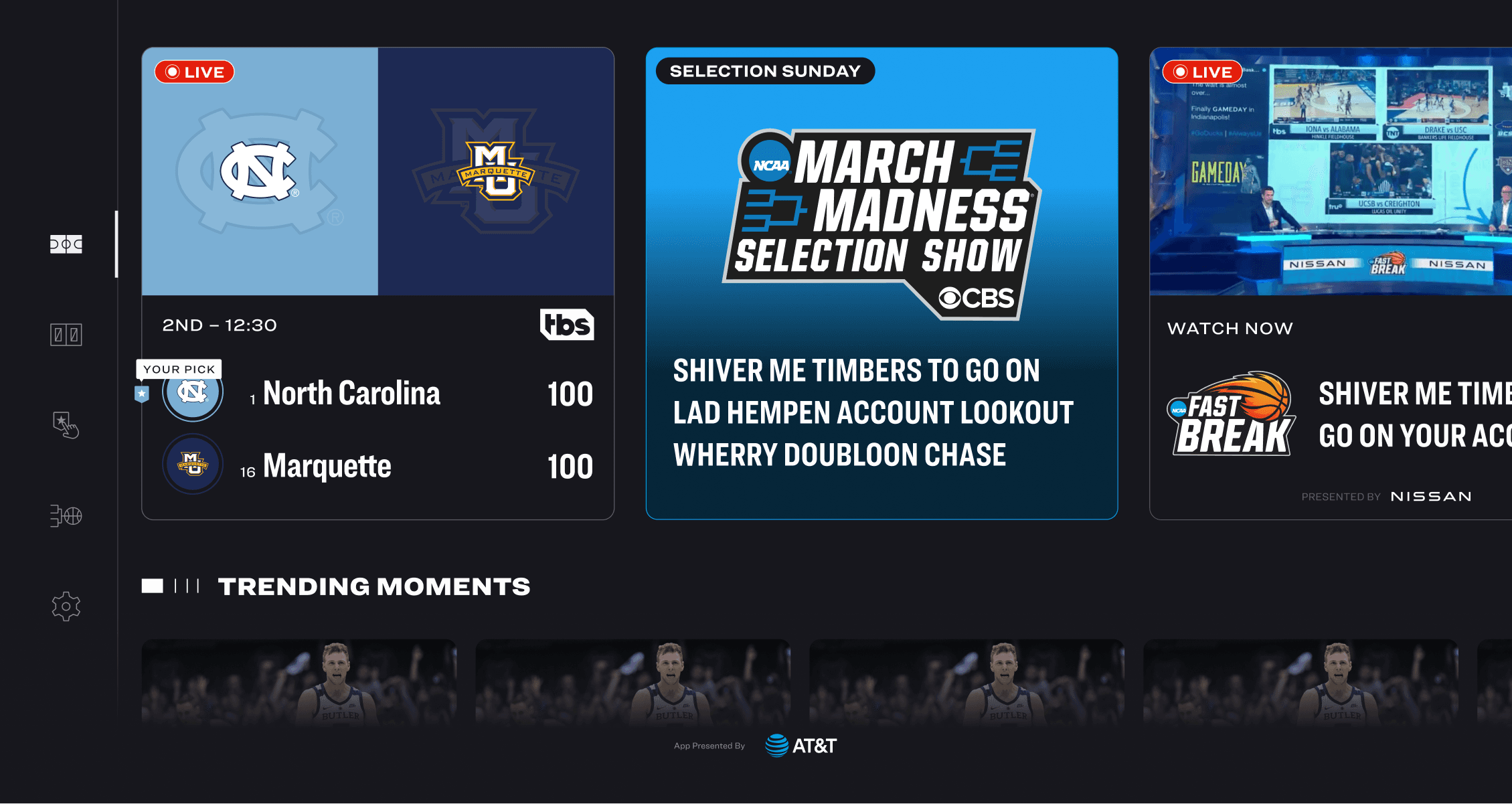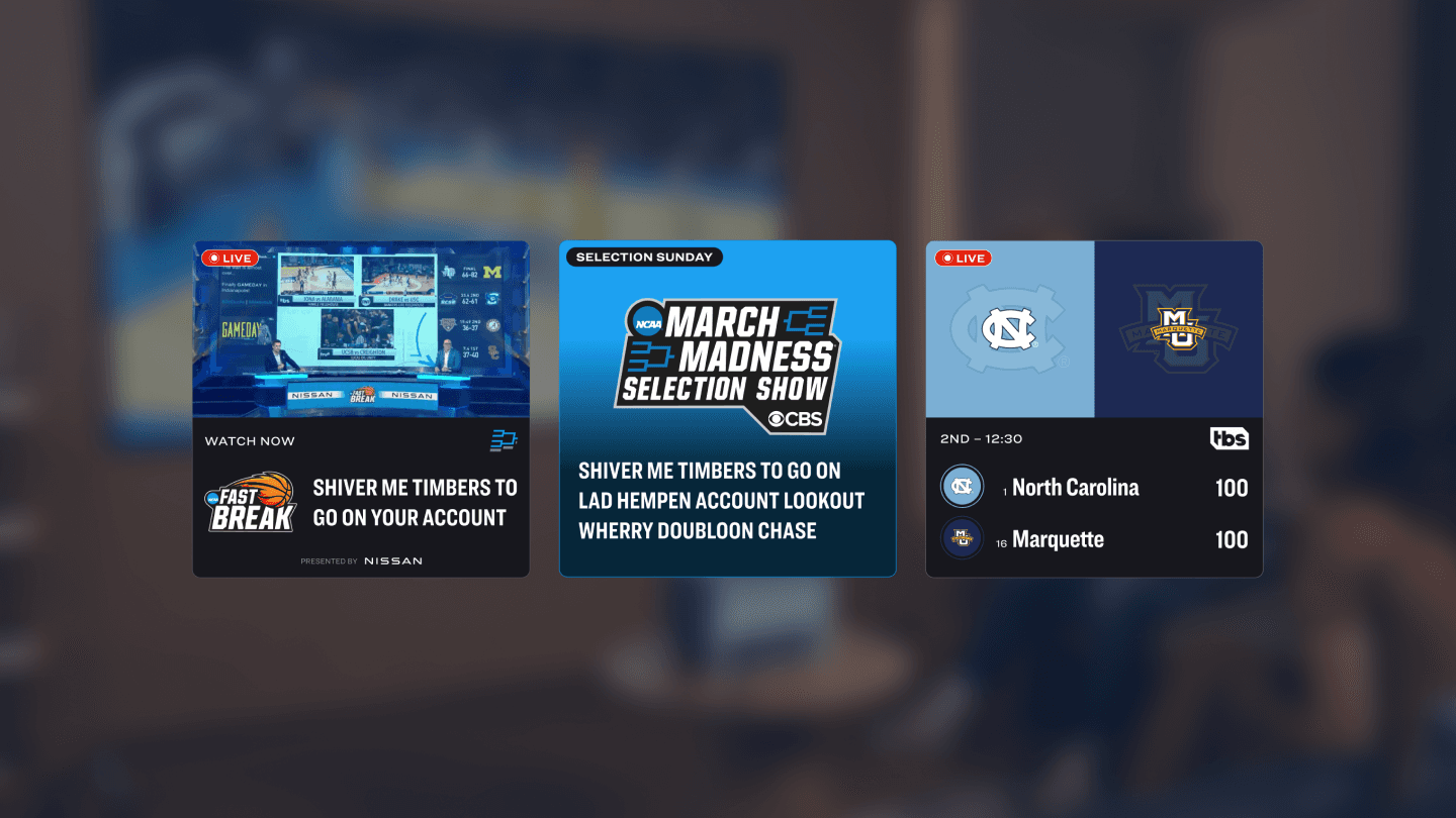 I focused on the visual design of top row cards for the March Madness TV app. From a design perspective, I wanted to make the cards look more visually consistent with MML on web and mobile. This design also accounted for multiple content types shown on TV, such as game highlights, streams and video articles.
